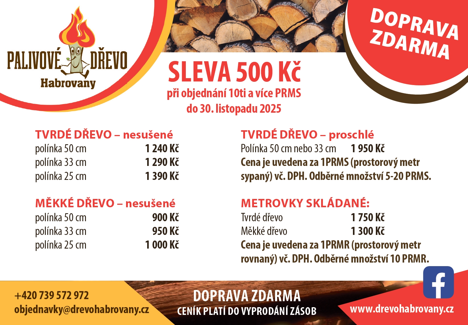 nabízí slevu 500 Kč při objednání 10 i a více sypaných metrů palivového dřeva. Platnost od 5.11 do 31.11.2025. Objednávejte na telefonním čísle : 739 572 972 (8:00 -15:00), nebo na www.drevohabrovany.cz.